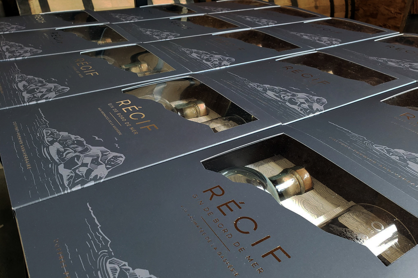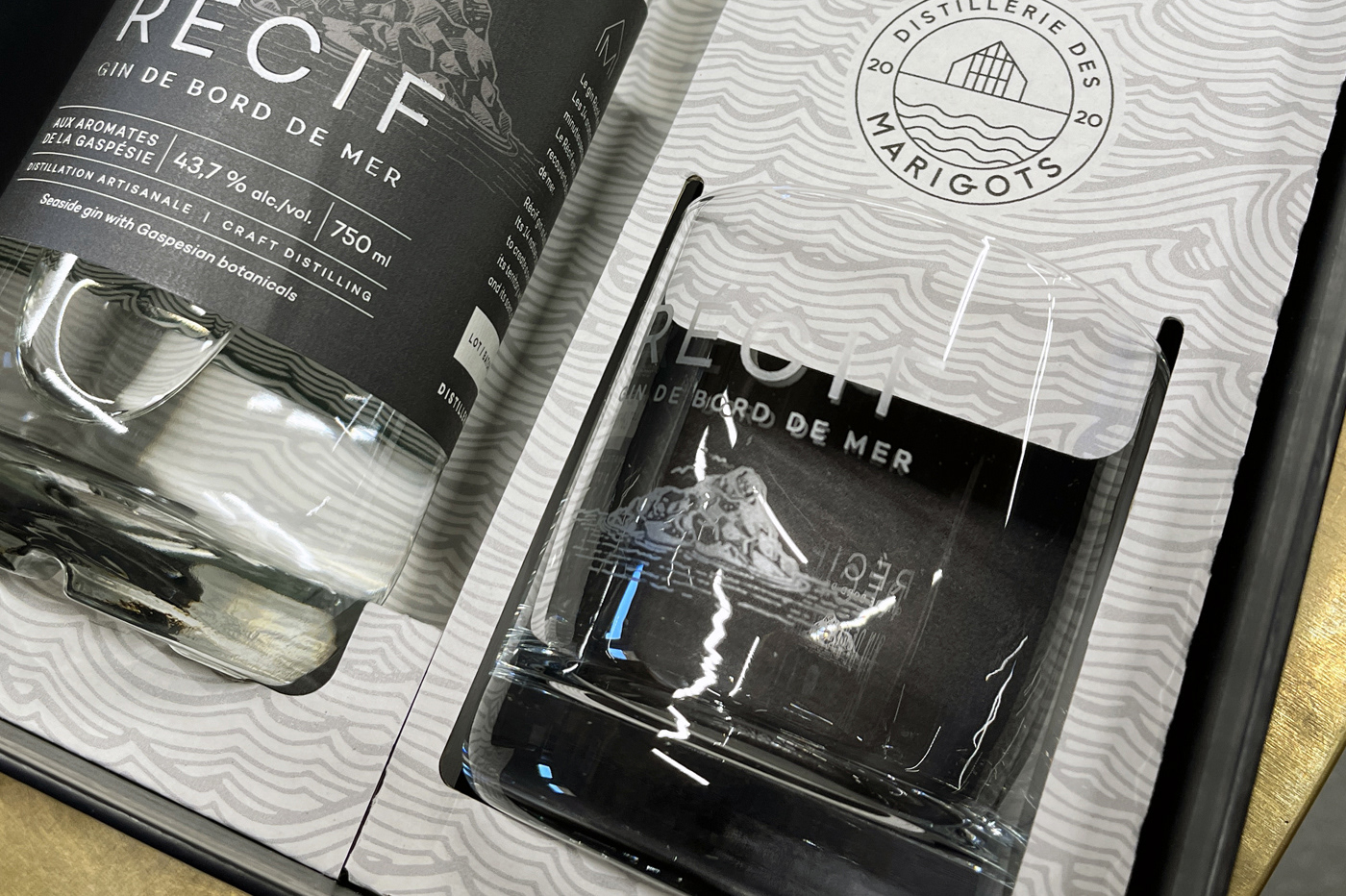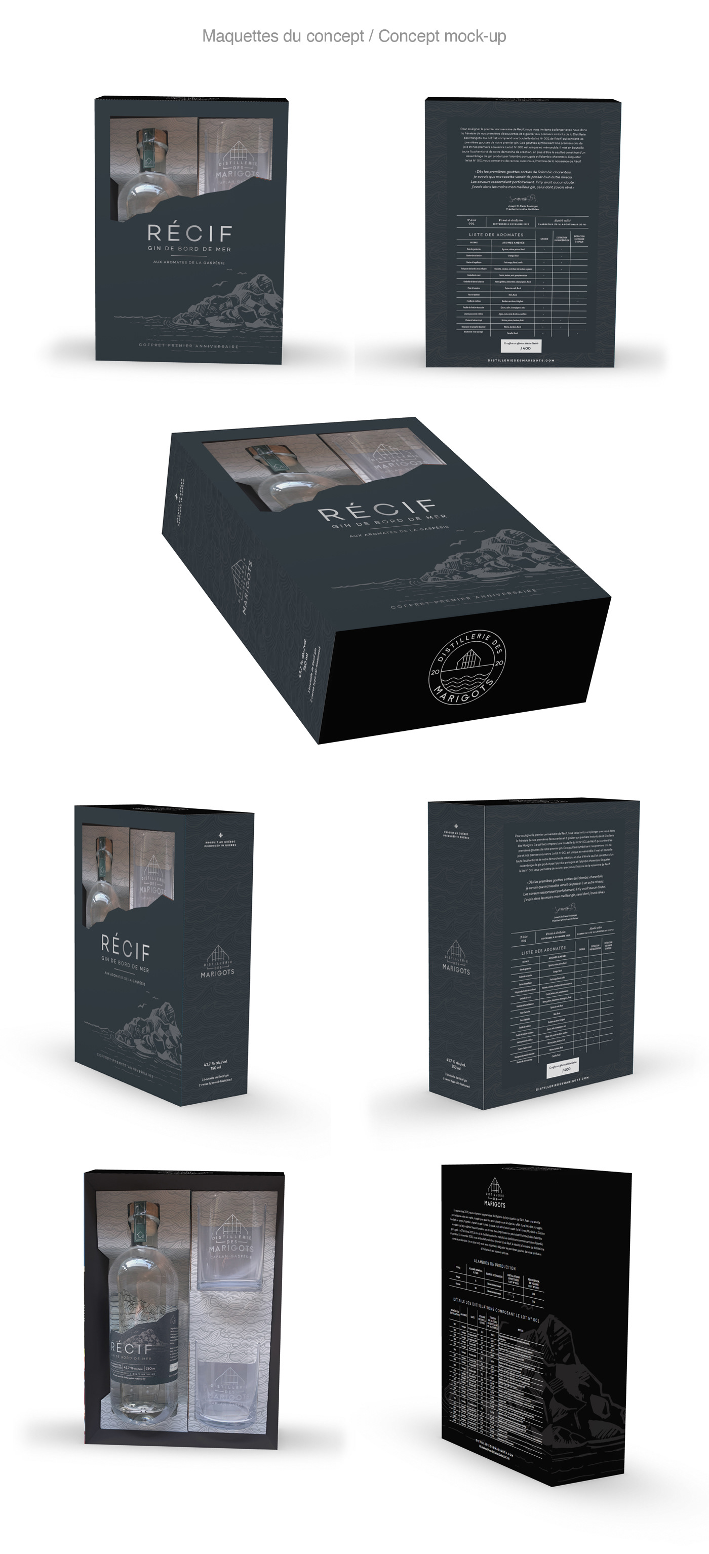 Design pour un coffret édition limité du gin Récif (Lot #001, 1er anniversaire) produit par la distillerie des Marigots.