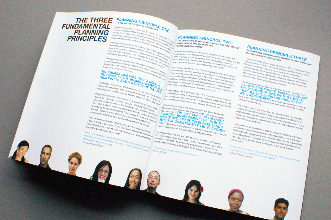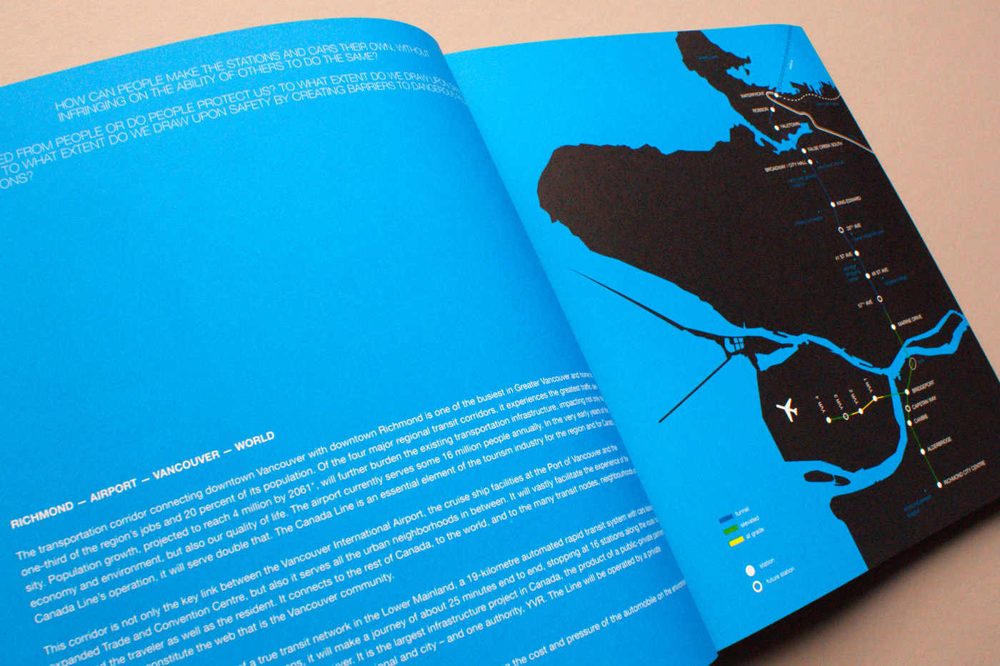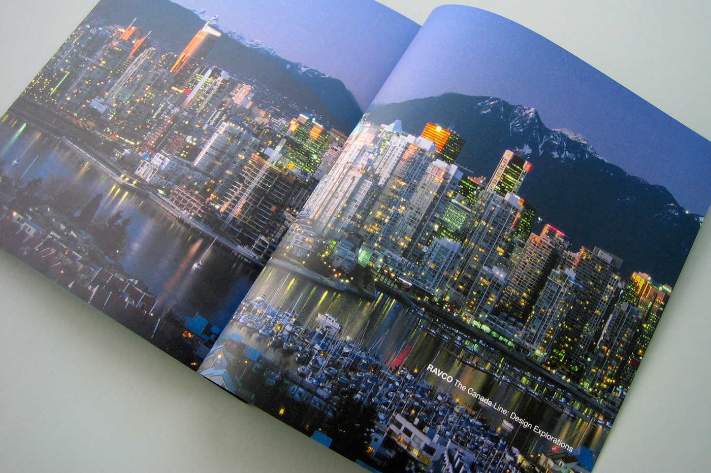 The goal of this brochure is to communicate the different objectives for the RAV (Canada) Line project in Vancouver. The concept is to use the different contrasts of the city, as well as questions for architects and designers to think about when they build the transit line. Le but de cette brochure est de communiquer les differents objectifs pour le projet Canada Line, un systeme de métro. La brochure utilise la présence de contraste présent dans la ville de Vancouver et provoque un questionnement pour les architectes et designers de ce projet. Agence: Envisioning+Storytelling Creative Director: Tom Pedriks Graphic Design: Sebastien Cantin Client : Ravco Corporation (Vancouver, British Columbia, CA)