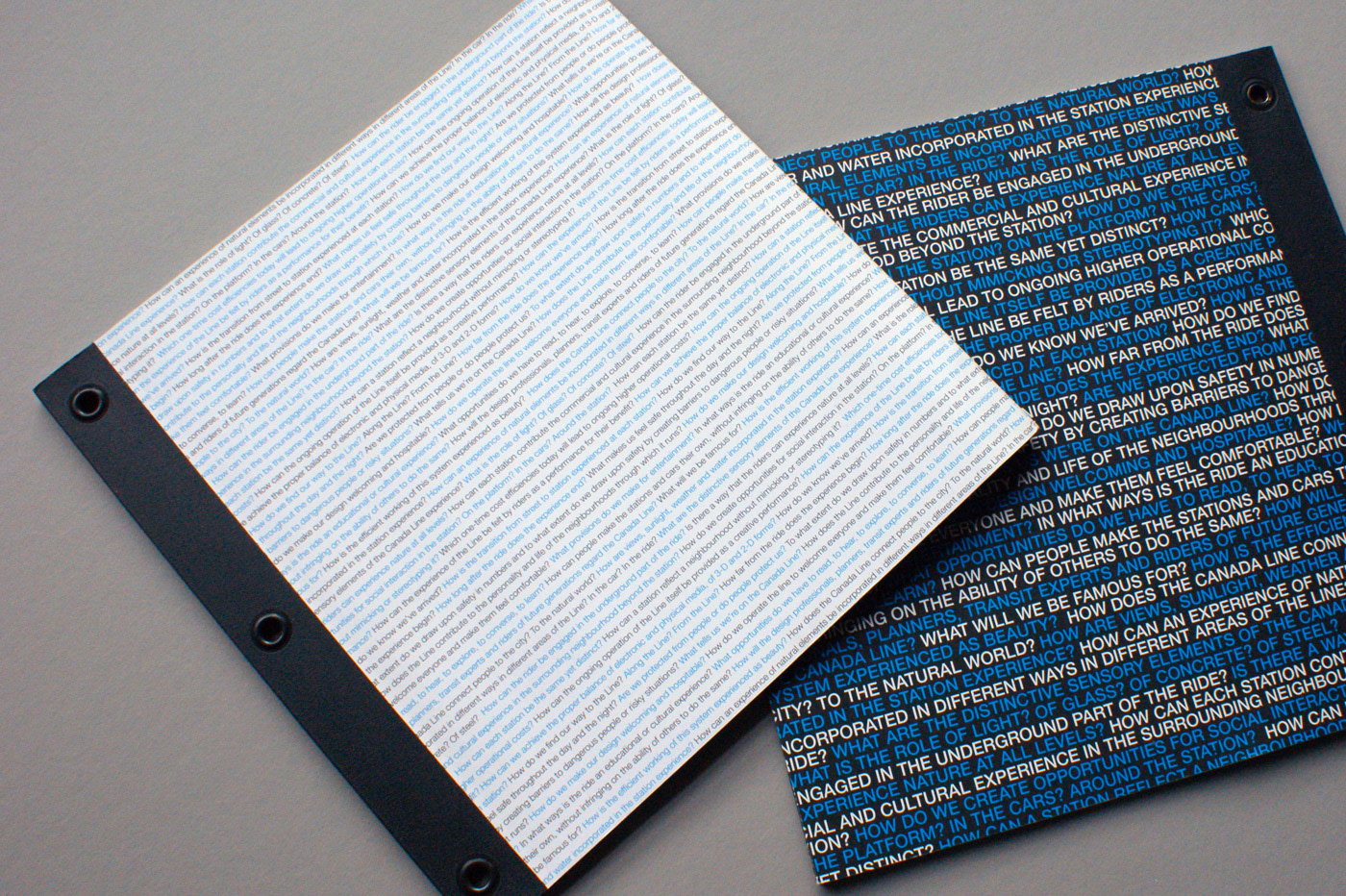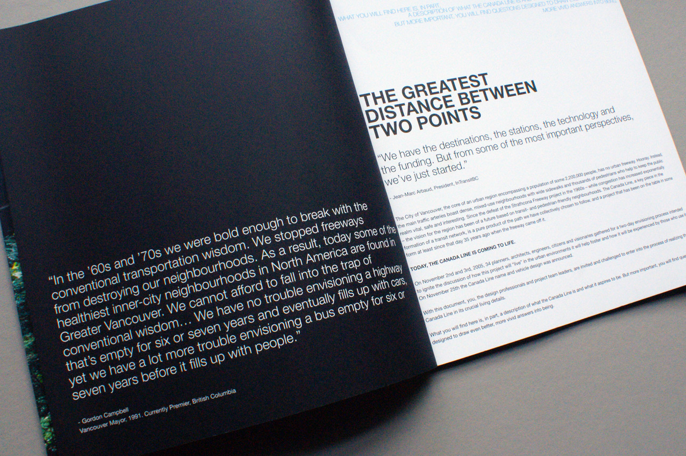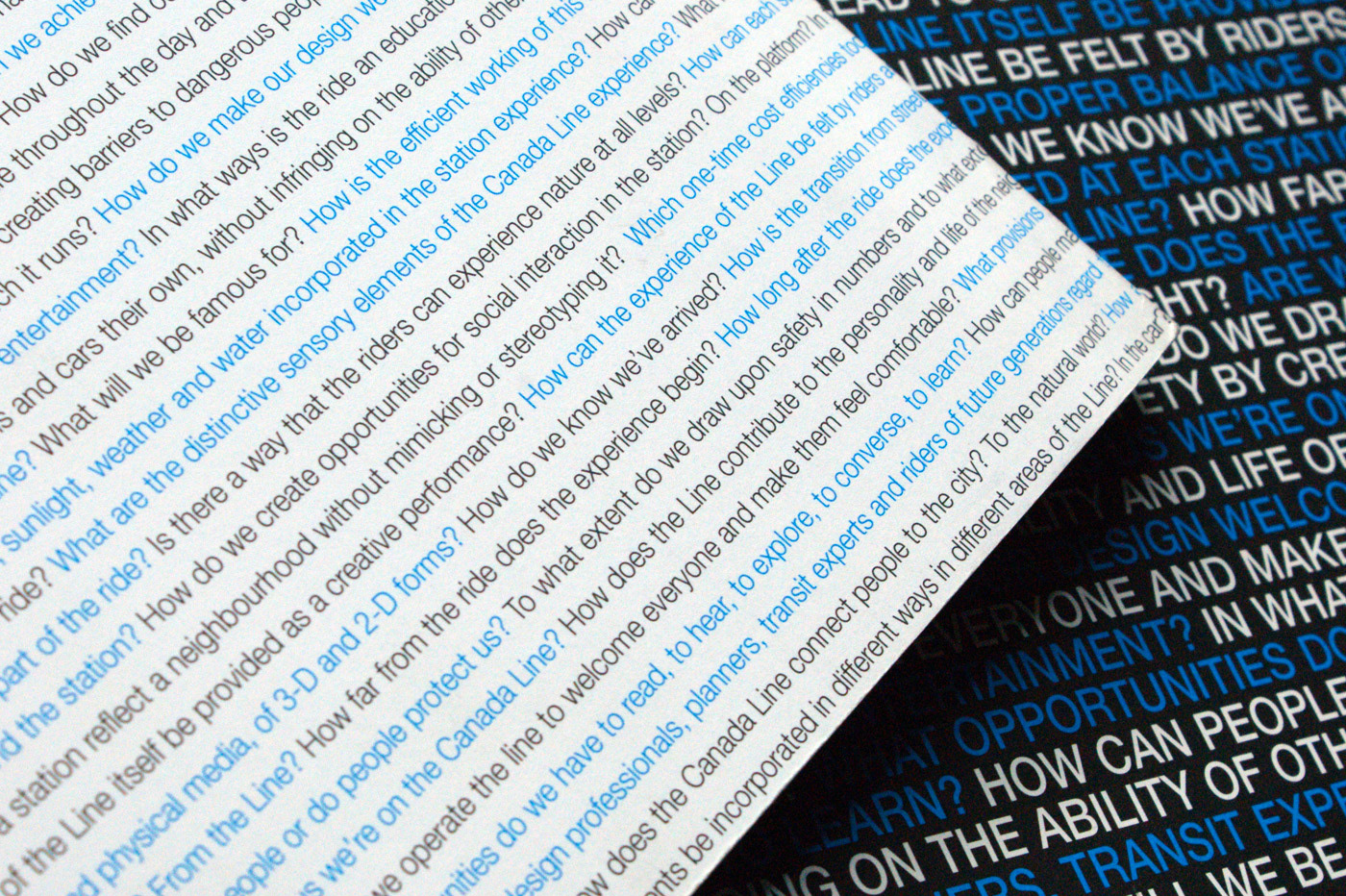 The goal of this brochure is to communicate the different objectives for the RAV (Canada) Line project in Vancouver. The concept is to use the different contrasts of the city, as well as questions for architects and designers to think about when they build the transit line. Le but de cette brochure est de communiquer les differents objectifs pour le projet Canada Line, un systeme de métro. La brochure utilise la présence de contraste présent dans la ville de Vancouver et provoque un questionnement pour les architectes et designers de ce projet. Agence: Envisioning+Storytelling Creative Director: Tom Pedriks Graphic Design: Sebastien Cantin Client : Ravco Corporation (Vancouver, British Columbia, CA)