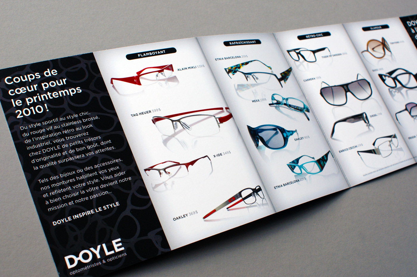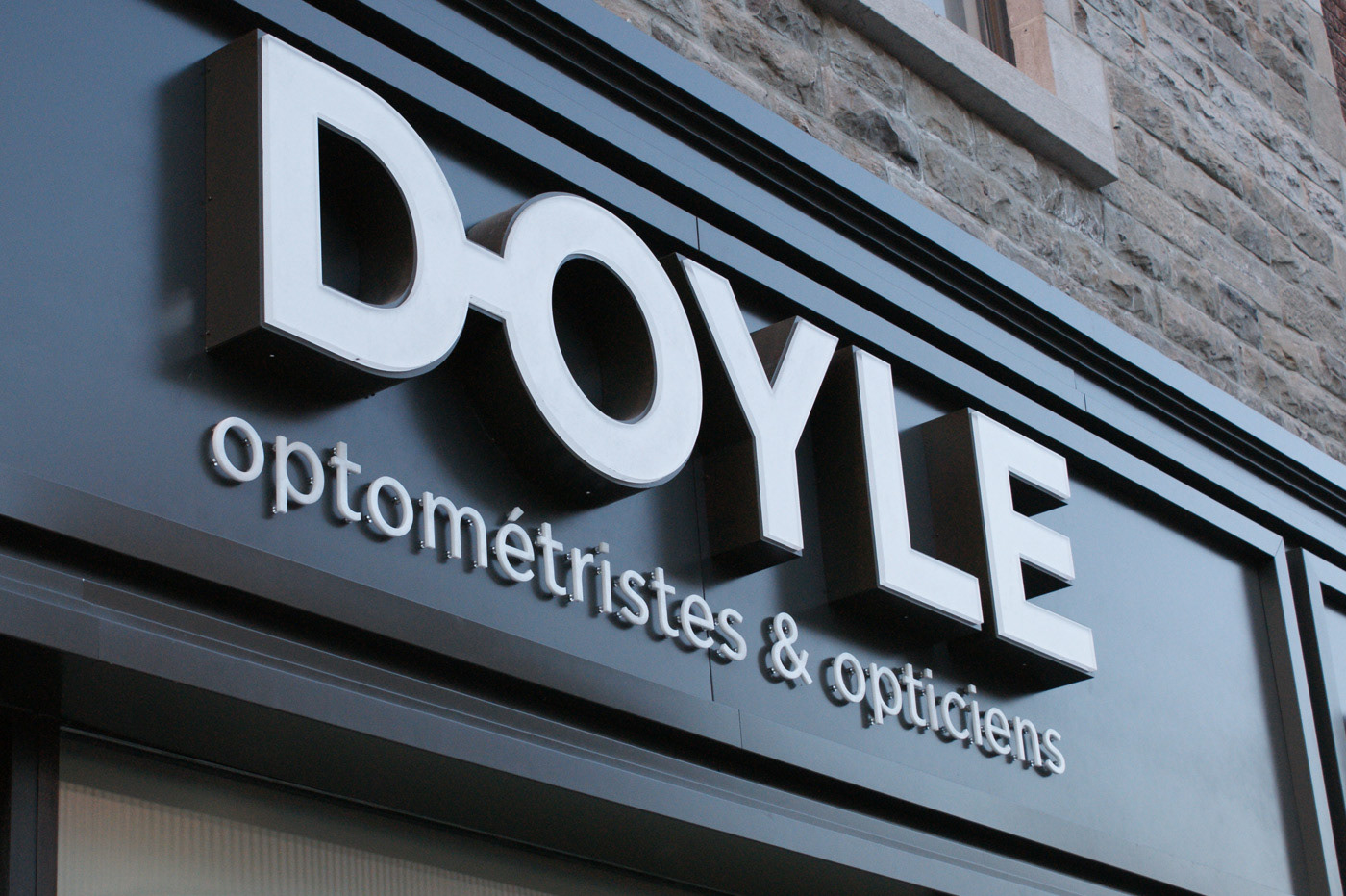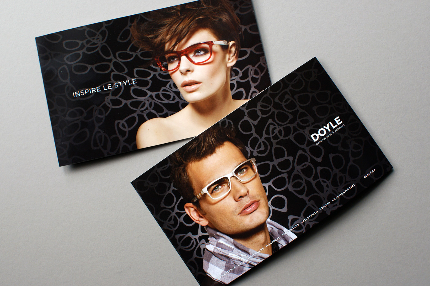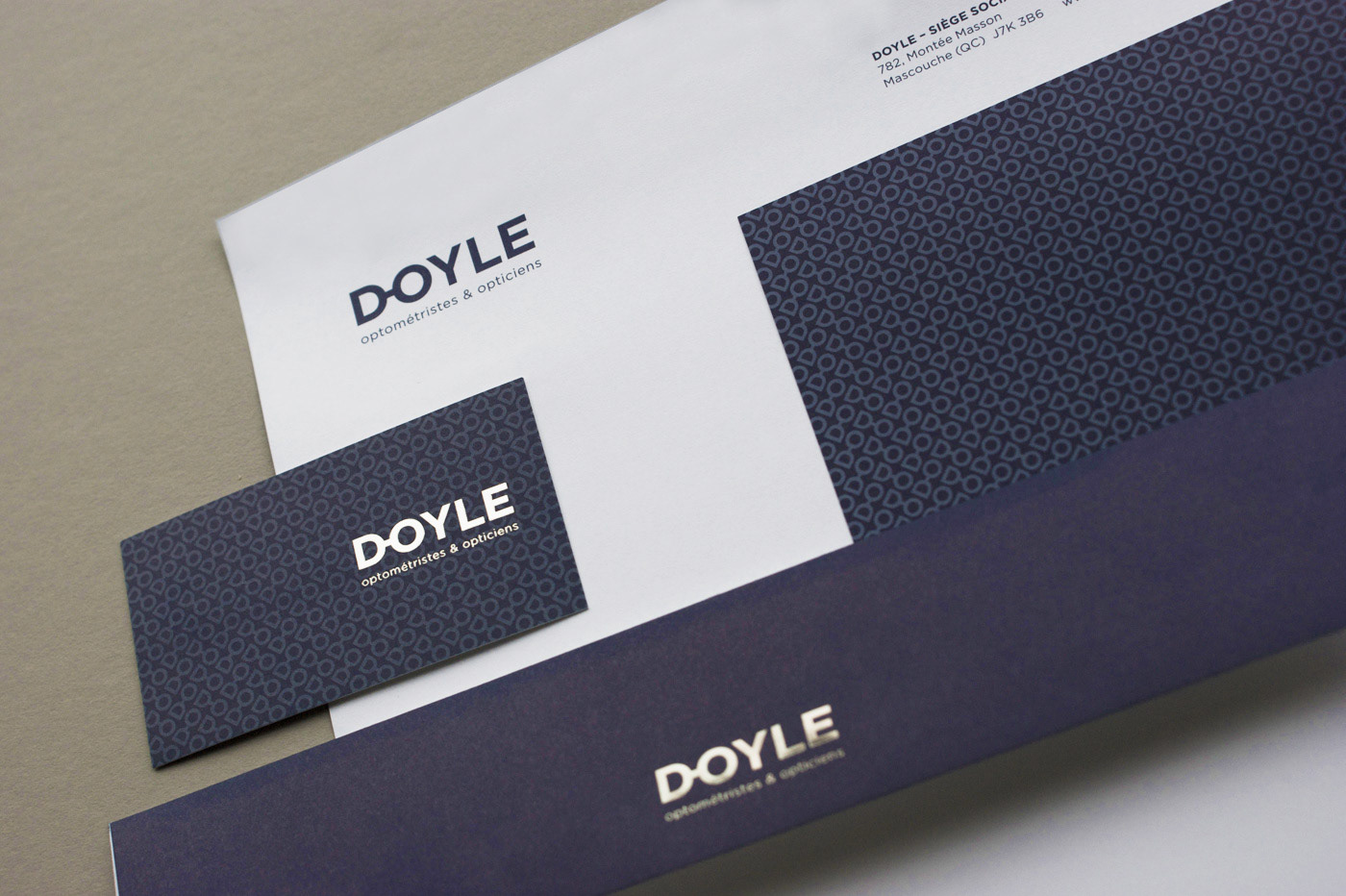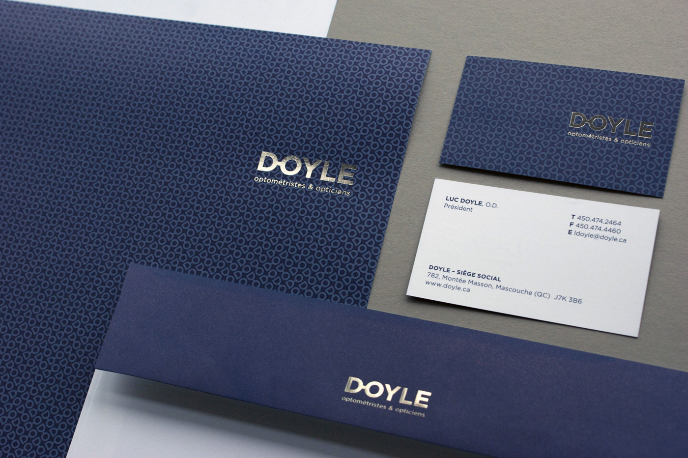 Visual identity refreshing, stationery and other components for an optometrist and eyewear boutique. Revision de l'identité visuelle, papeterie et autres composante d'identité pour une chaine d'optique de la région de Montréal. Agency: Imago Creative Director: Carl Gagnon Graphic Design: Sebastien Cantin Production Artist: Emilie Parent Client: Doyle, Optométristes et opticiens (Montréal, Québec, CA)