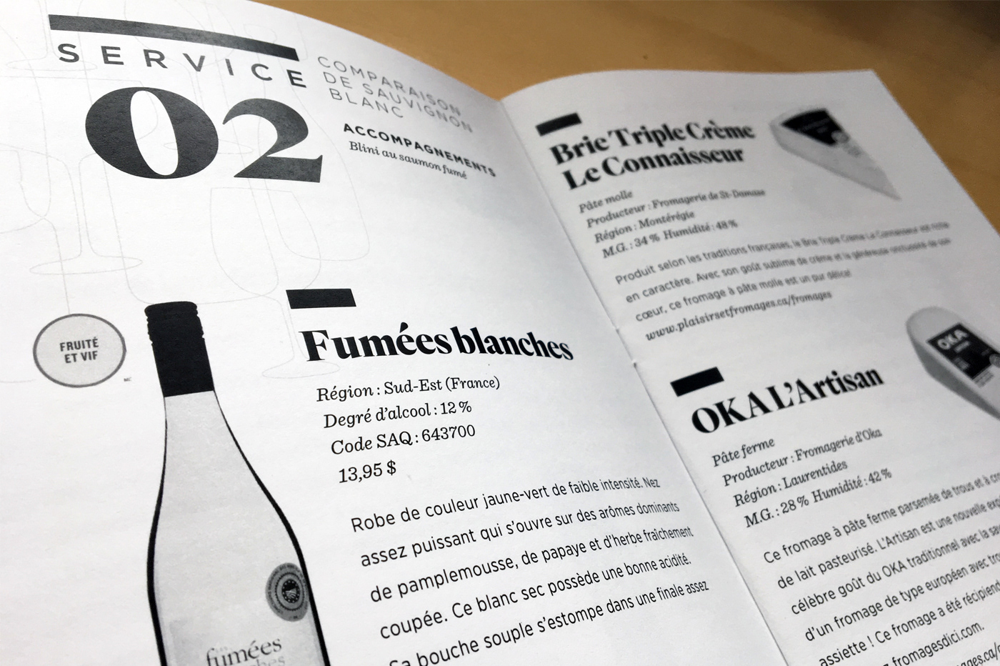 Design d'une brochure pour un évènement gastronomique-bénéfice de vins et fromages. Design of a brochure for a gastronomic event-benefit of wines and cheeses. Agence: Sébastien Cantin Design Graphique Designer Graphique: Sebastien Cantin Impression : Concept K Client: Maison d'aide et d'hébergement L'Émergence (Maria, Québec, CA)