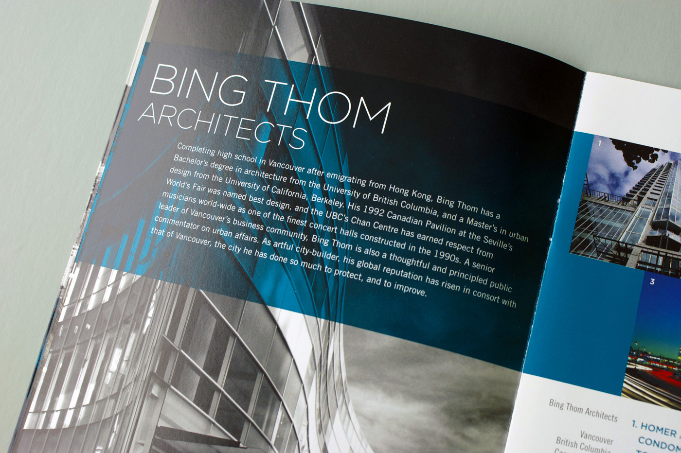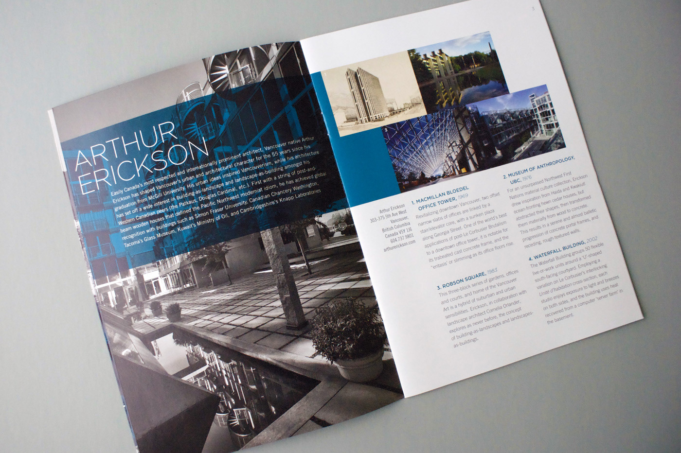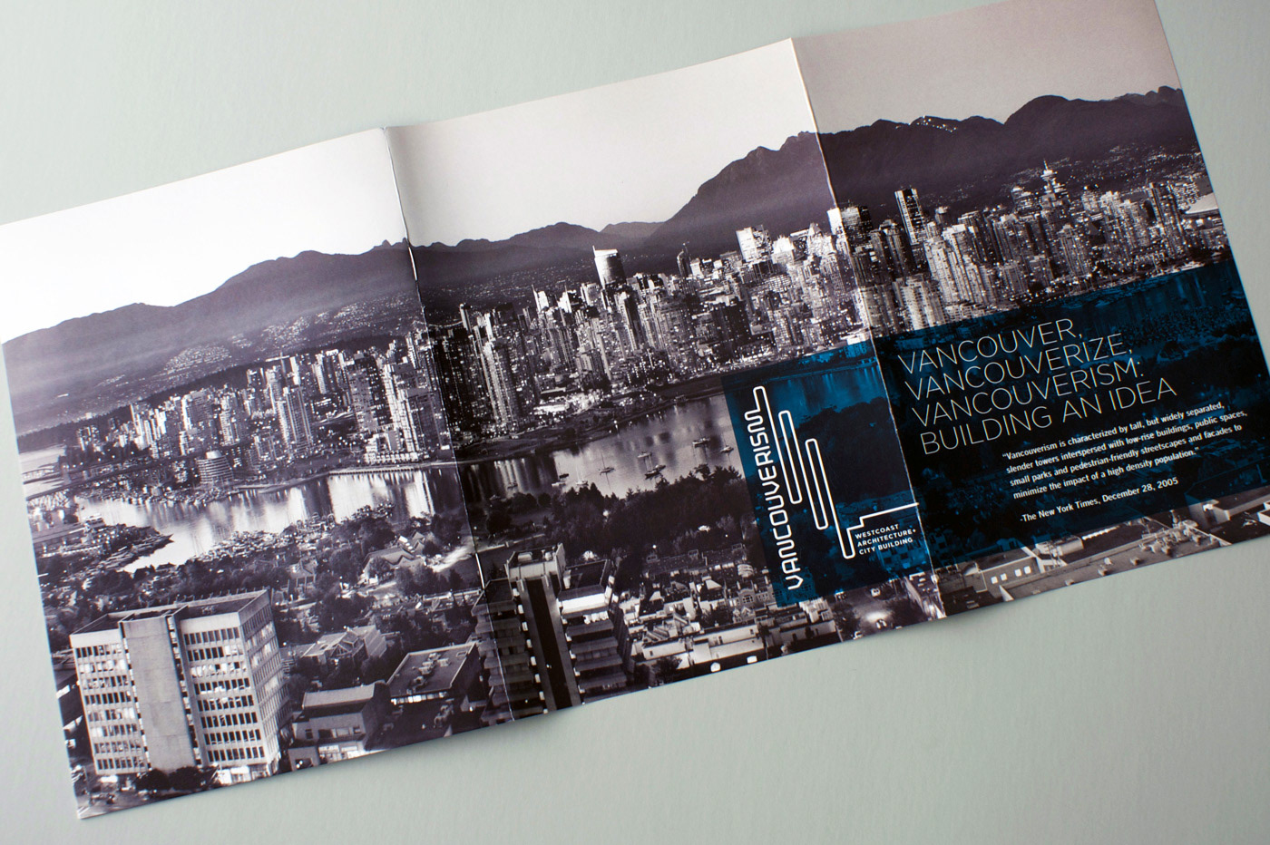 Identity, collateral design and exhibit design work for "Vancouverism: Westcoast Architecture + City Building". This exhibition is featuring the work of famous Vancouver-based architects Arthur Erickson, Bing Thom, James Cheng and Fast + Epp Structural Engineers. The exhibition started in London, UK. Identité, composante visuelle et design d'une exposition intitulée "Vancouverism: l'Architecture de la côte ouest + Ville en construction". Cette exposition démontre les travaux de grand architectes Vancouverois: Arthur Erickson, Bing Thom, James Cheng et Fast + Epp Structural Engineers. Cette exposition à débuté à Londre (Royaume-Unis). Agency: Cause+Affect Creative Director: Steven Cox, Jane Cox Art Direction: Sebastien Cantin Graphic Design: Sebastien Cantin, Josiane Marquis Exhibition Design: Steven Cox, Sebastien Cantin Client: Canadian High Commission (London, UK)